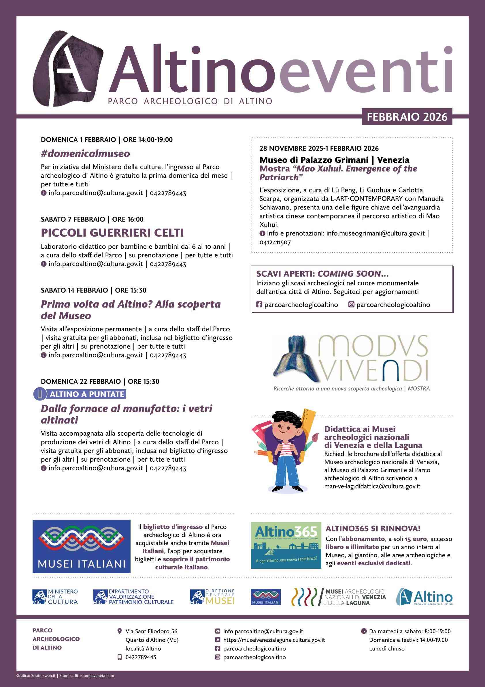 ·       sabato 14 febbraio, alle 15:30, Prima volta ad Altino? Alla scoperta del Museo, visita all’esposizione permanente, gratuita per gli abbonati, inclusa nel biglietto d’ingresso per gli altri, a cura dello staff del Parco, su prenotazione;